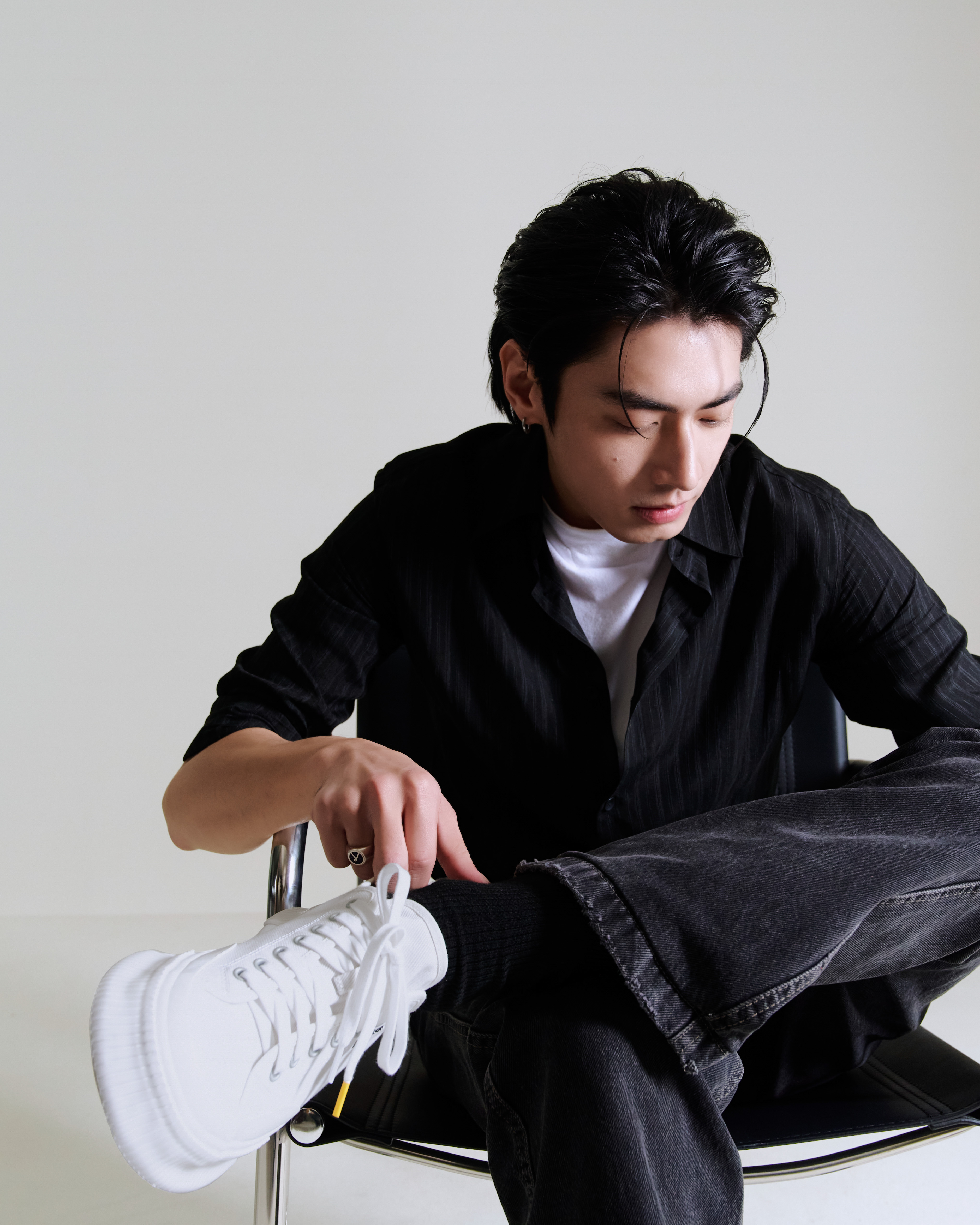 宋柏緯上身以簡約俐落白色T恤搭配深色襯衫