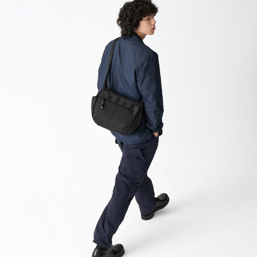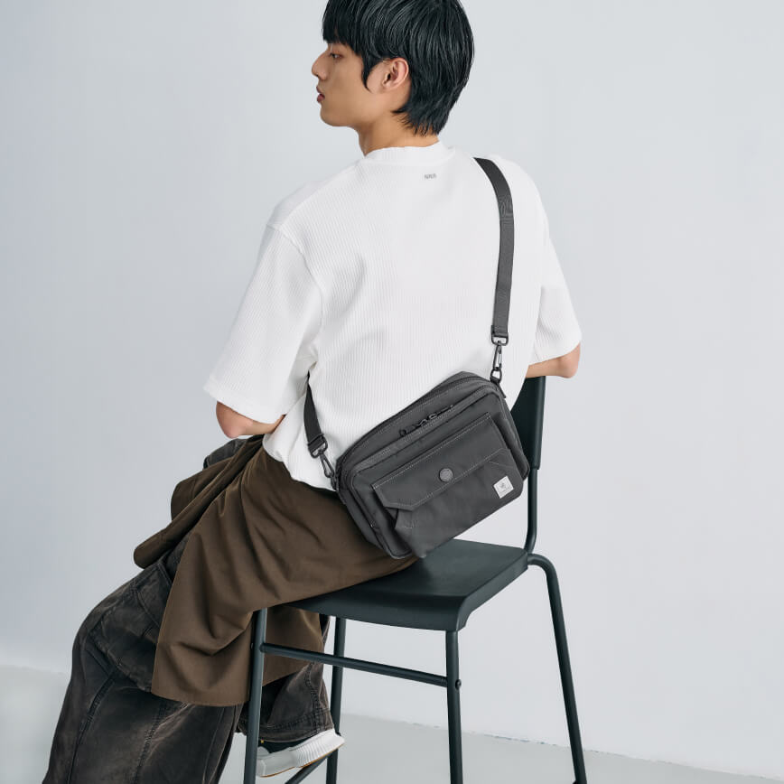 實踐都會生活中的自在感,搭配舒適、多層次的機能服飾,選用深色系尼龍斜背包,展現穿搭的融合感,適合城市移動與日常應用。
