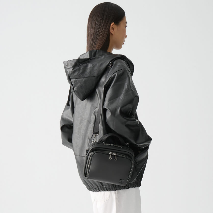 斜背包的彈性來自於其自由背負性。依行走路線或需求,可隨時將包款前後切換,如需增添機動性可置於後方,背於前方則可提升造型層次與使用安全度。