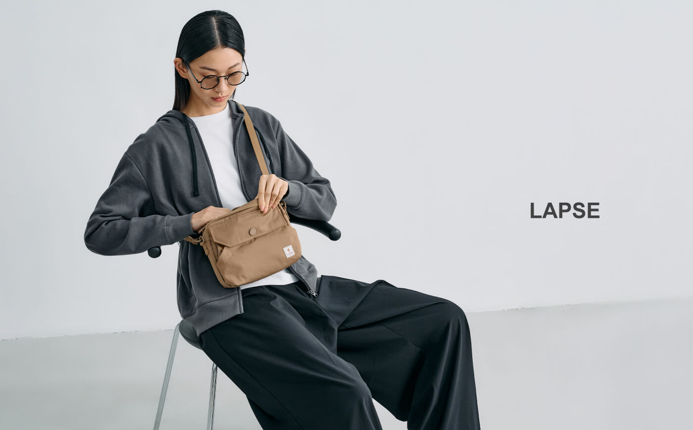 LAPSE系列選用手感極佳的輕盈皺縮面料製成,以柔和色系巧妙搭配,融入鐵礦灰、駝棕色等大地色選,散發溫潤氣息,同時打造無侷限的空間收納,凸顯包款功能性,隨手取物不設限,專為都市行者打造,釋放無拘束的生活態度。