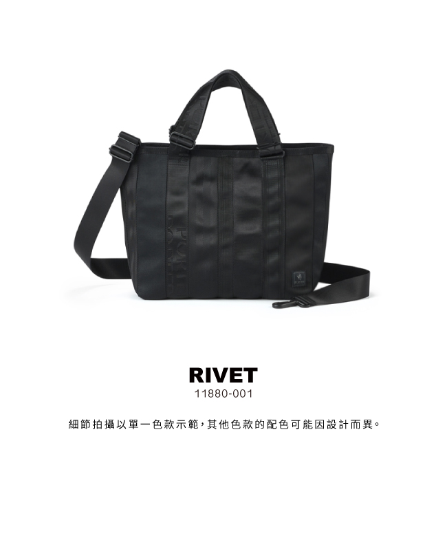RIVET 系列織帶面料一體成型,肩背帶自包底延伸,強化耐用與結構穩定。大容量、高效收納,滿足頻繁旅行與講求機能風格的潮流需求。