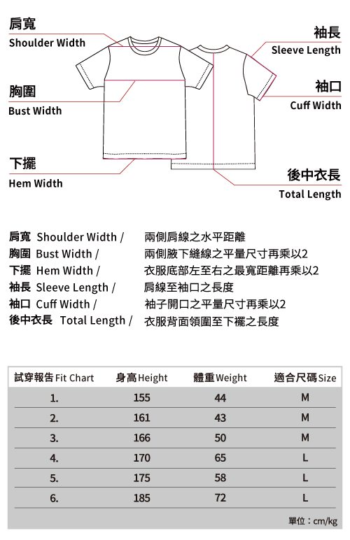 ※ 本尺寸表皆為水平測量,會因布料彈性、水洗處理、測量起訖點等因素,與實際商品尺寸略有誤差,誤差尺寸±2cm/mm,在國際驗貨標準範圍都是屬於可接受範圍,並不屬於瑕疵。