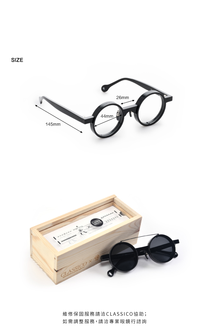 | 前掛式圓框墨鏡 | 鏡片寬度(mm) | 鼻樑架寬度(mm) | 鏡腳長度(mm) |