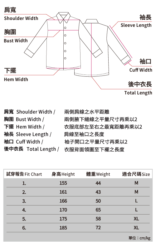 ※ 本尺寸表皆為水平測量,會因布料彈性、水洗處理、測量起訖點等因素,與實際商品尺寸略有誤差,誤差尺寸±2cm/mm,在國際驗貨標準範圍都是屬於可接受範圍,並不屬於瑕疵。