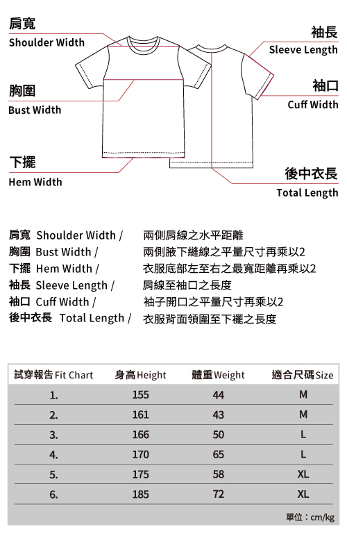 ※ 本尺寸表皆為水平測量,會因布料彈性、水洗處理、測量起訖點等因素,與實際商品尺寸略有誤差,誤差尺寸±2cm/mm,在國際驗貨標準範圍都是屬於可接受範圍,並不屬於瑕疵。